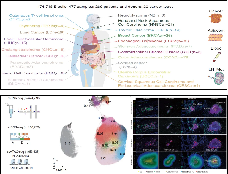 2024年,復(fù)旦大學(xué)附屬中山醫(yī)院樊嘉院士和高強(qiáng)教授、中國科學(xué)院上海免疫與感染研究所張曉明研究員、浙江大學(xué)基礎(chǔ)醫(yī)學(xué)院郭國驥教授合作在Science上發(fā)表了題為A blueprint for tumor-infiltrating B cells across human cancers的研究論文,結(jié)合單細(xì)胞轉(zhuǎn)錄組、 B細(xì)胞受體免疫組庫和表觀基因組的多組學(xué)數(shù)據(jù),系統(tǒng)性地刻畫了腫瘤浸潤性B細(xì)胞的異質(zhì)性、動(dòng)態(tài)分化和表觀調(diào)控機(jī)制。創(chuàng)新地揭示了腫瘤微環(huán)境中廣泛存在的EF應(yīng)答的癌種偏好性、空間定位特征、臨床意義及潛在的誘導(dǎo)調(diào)控機(jī)制。