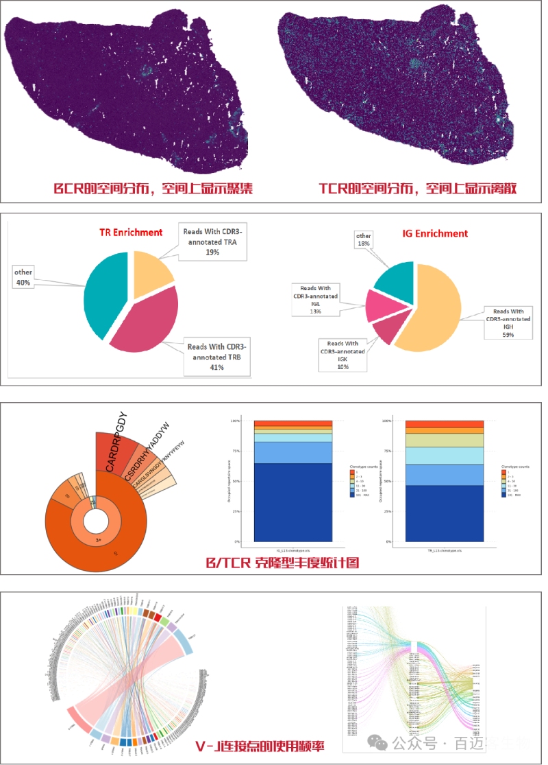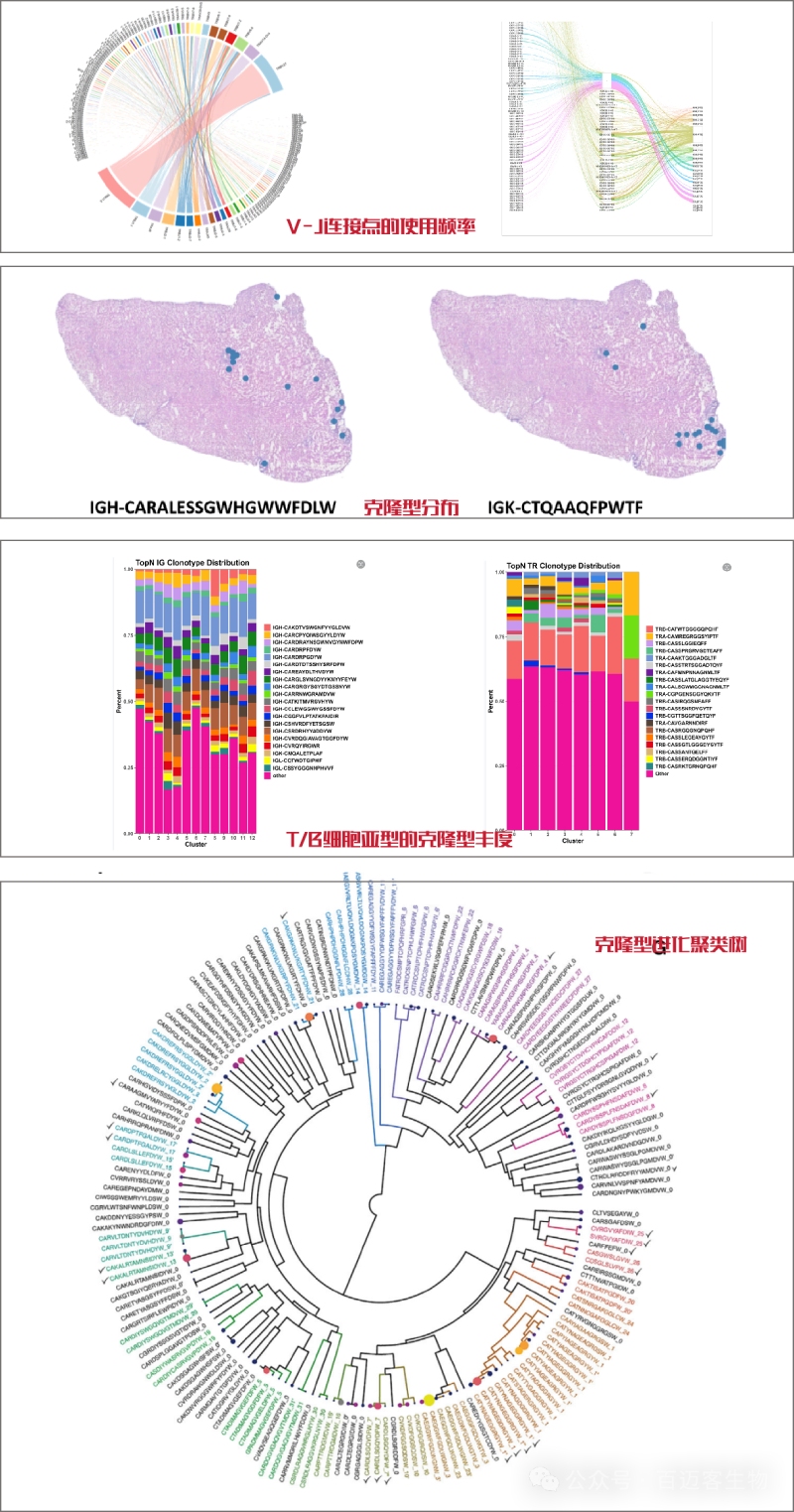 腫瘤樣本我們可以類比為一處具有復(fù)雜地貌的特殊地理環(huán)境,不同的環(huán)境造就了各種細(xì)胞的不同狀態(tài),而T/B細(xì)胞在不同的“選擇壓力”下邊進(jìn)行了不同的“適應(yīng)性進(jìn)化”。對(duì)不同生態(tài)位的T/B細(xì)胞尤其是TCR/BCR進(jìn)行測定,有助于我們?nèi)ソ沂久庖呒?xì)胞的克隆起源和進(jìn)化過程。例如,通過分析TCR的VDJ重排,可以追蹤T細(xì)胞克隆的起源和擴(kuò)增過程。這種分析有助于理解免疫細(xì)胞在不同生理和病理狀態(tài)下的動(dòng)態(tài)變化。